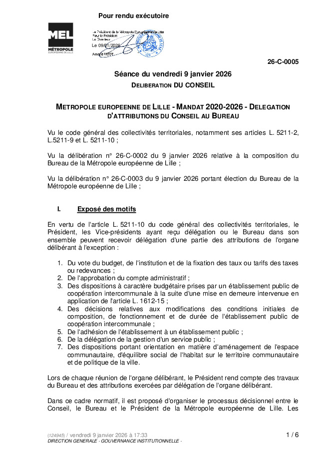 • 26-C-0005 : Métropole européenne de Lille - Mandat 2020-2026 - Délégation d'attributions du Conseil au Bureau (.pdf)